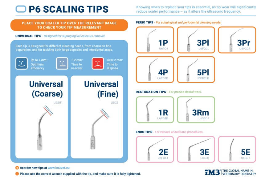 P6 Piezo scaler-spisser er utviklet for å møte de ulike utfordringene som er i en dental veterinærpraksis. Sortimentet dekker sentrale områder som profylakse, periodonti, restaurering og endodonti, og hver spiss er utformet for å sikre effektiv, skånsom og pasientvennlig behandling.