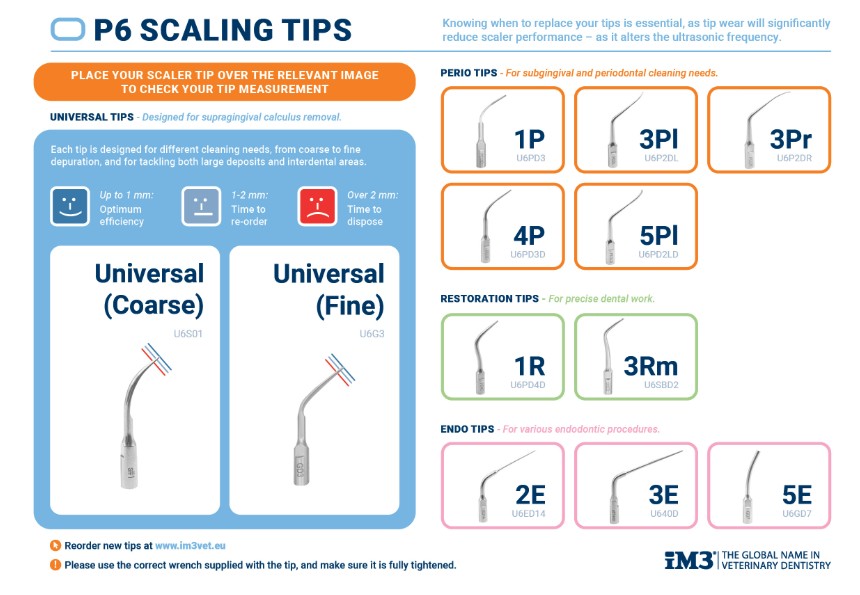 P6 Piezo scaler-spisser er utviklet for å møte de ulike utfordringene som er i en dental veterinærpraksis. Sortimentet dekker sentrale områder som profylakse, periodonti, restaurering og endodonti, og hver spiss er utformet for å sikre effektiv, skånsom og pasientvennlig behandling.