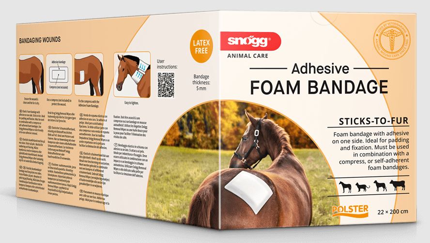 Adhesive Foam Bandage er en elastisk skumbandasje med god kleb til hud og pels. Bandasjen har lim på den ene siden og er ideel for polstring og fiksering eller feste av enheter for overvåkning som f.eks EKG elektroder. Man kan enkelt lage en sårbandasje ved å kombinere Adhesive Foam bandage med en kompress eller med Thick Foam Bandage. Bruk Snøgg Removal Wipes eller hudvennlig olje for å fjerne limrester. Lateksfri.