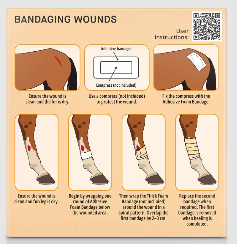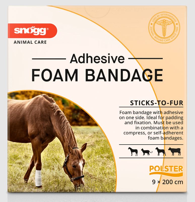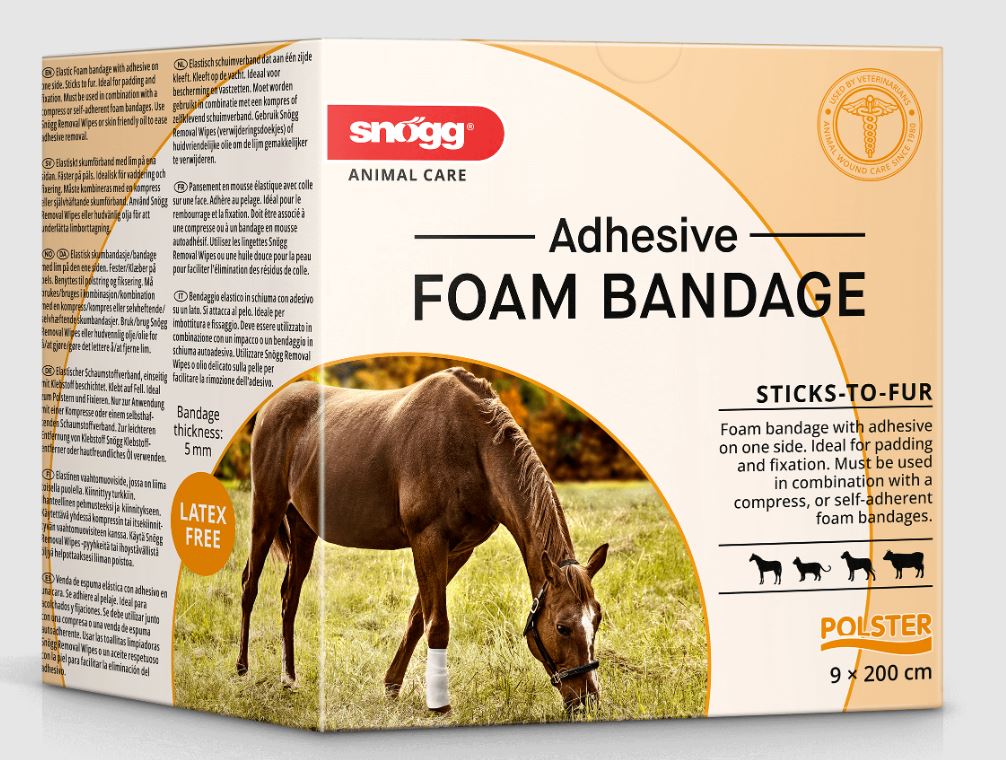 Adhesive Foam Bandage er en elastisk skumbandasje med god kleb til hud og pels. Bandasjen har lim på den ene siden og er ideel for polstring og fiksering eller feste av enheter for overvåkning som f.eks EKG elektroder.  Man kan enkelt lage en sårbandasje ved å kombinere Adhesive Foam bandage med en kompress eller med Thick Foam Bandage. Bruk Snøgg Removal Wipes eller hudvennlig olje for å fjerne limrester. Lateksfri.