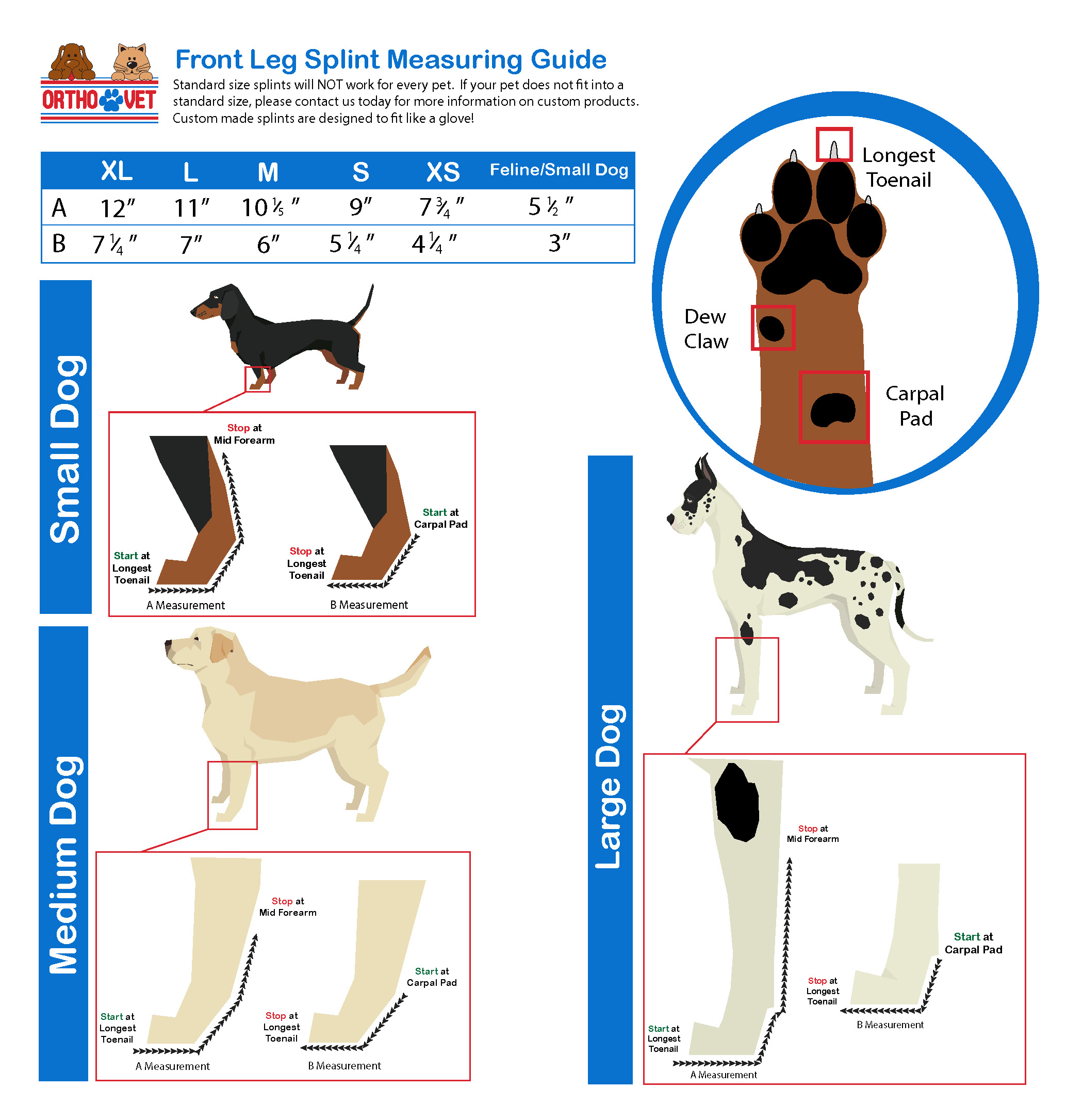 The OrthoVet “Carpal Splint” is a lightweight brace designed to support the carpal joint. Ideal for tendon and ligament damage and stabilization after surgical procedures. Note: The carpal splint supports the wrist or carpus only and does not extend under the dog’s paw. Fitting video Click