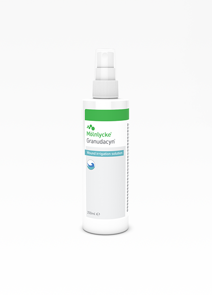 Granudacyn® er en skyllevæske til rensing og fukting av akutte, kroniske og kontaminerte sår, inkludert overfladiske brannskader og delhudsbrannskader. Hypoklorsyre (HOCl) er en stabil løsning som gjør Granudacyn til en sikker skyllevæske. HOCl hindrer spredning av gram-positive og gram-negative bakterier, inkludert; MRSA, ORSA,VRSA,VRE, virus, sopp og sporer.