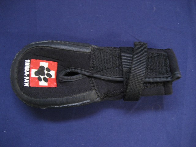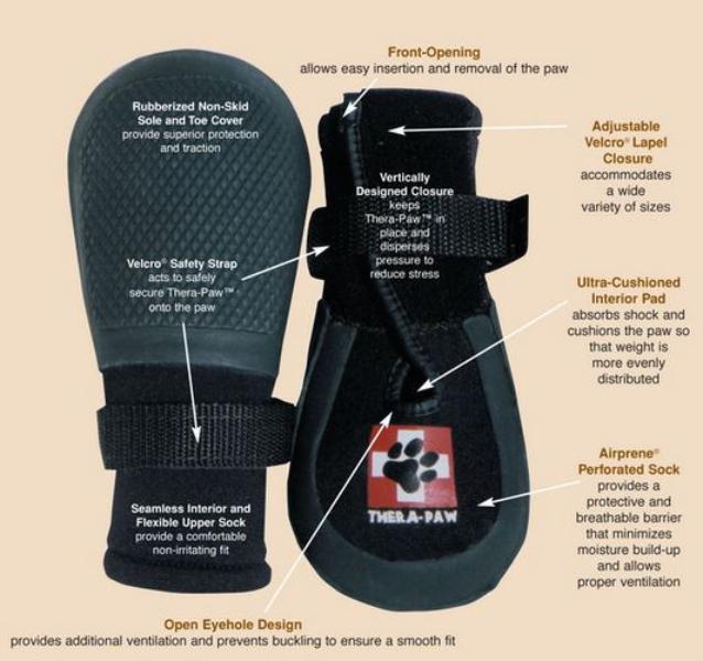 The ultra-cushioned interior pad alleviates pain, which reduces lameness, and promotes more even weight distribution. The perforated top sole and eye-hole design allow the paw to breathe, reducing moisture build-up at the injured site. Thera-Paw is easily cleaned by rinsing with warm water. Mild detergent may be used. It air dries in less than one hour, and is ready for immediate reapplication.