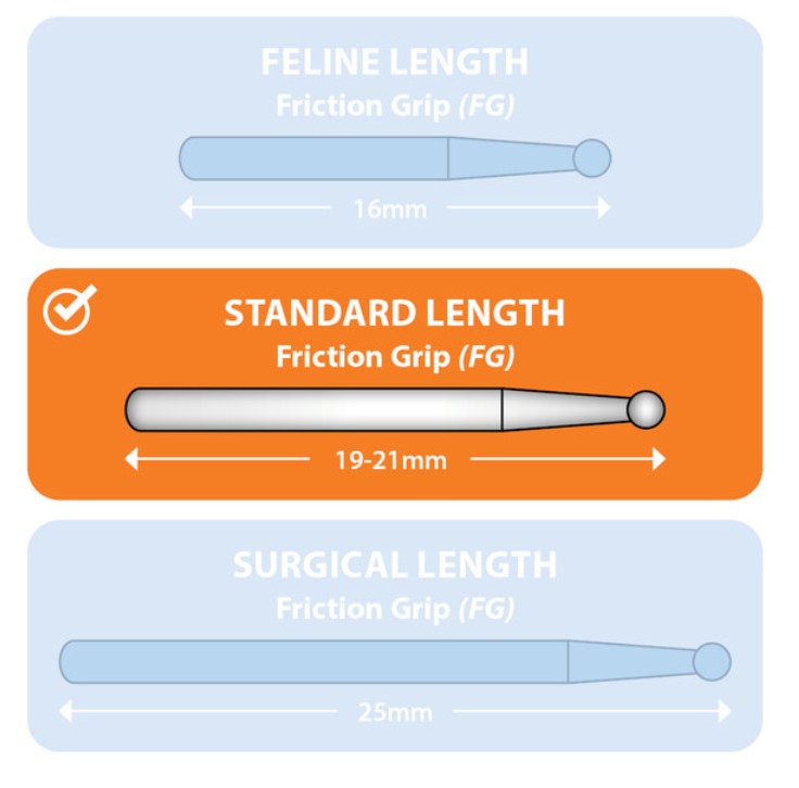 Friction grip (FG) burs are typically used in high-speed handpieces. iM3 recommends disposing of burs between each patient or if they become dull during long procedures, to reduce turbine wear on the high-speed handpiece. These burs are intended for single use, and the cost should be factored into each procedure.