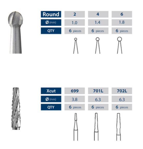 We also include the FG Crosscut Taper Fissure Bur, specially designed for sectioning teeth. This bur type is essential for various dental procedures. The kit includes x-cut sizes 699, 701 L, and 702L. iM3 recommends sizes 699 and 701L for use with small dogs and cats, while size 702L is recommended for larger dogs.