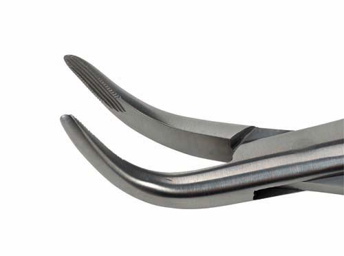 Root tip extractions forceps have grooved tips with fine curved ends