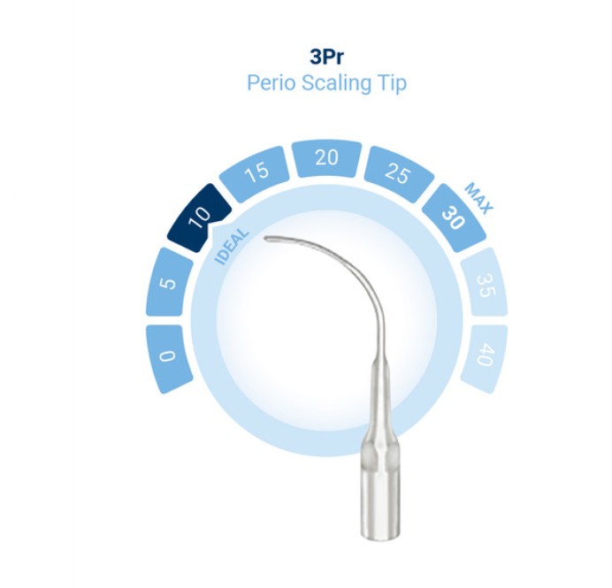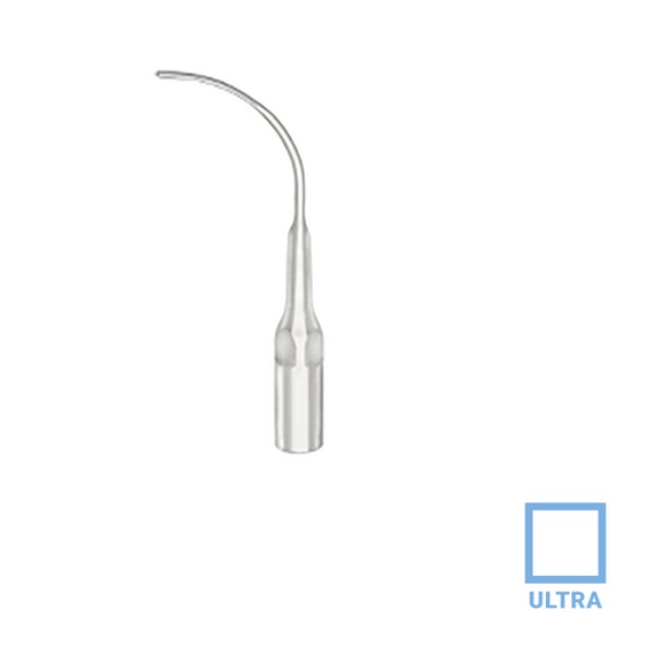 Right-curved tip for periodontal debridement. Made from high quality stainless steel and supplied in autoclavable holder with tip wear guide.