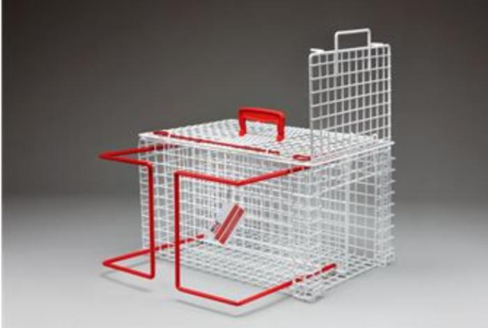 Also referred to as a 'Crush Cage' or 'Squeeze Box' by veterinary professions, this basket includes a restraining panel allowing the cat to be gently held still so that an intra-muscular injection (or other treatment) may be given. The basket consists of a standard carrying basket fitted with an movable internal partition with running bars attached which extend outside the basket to form handles. In practice, the partition is drawn forward until the animal is held gently but firmly against the basket wall. Held in this position, the handles can be pressed together using only one hand whilst the injection may be administered with the other. Available with a slide up door panel at one end, this system allows the transfer of a cat from any of the MDC cat traps eliminating the need to handle feral or fractious cats. Dimensions: length 46cm x width 29cm x height 29cm. Weight 2.9kg.