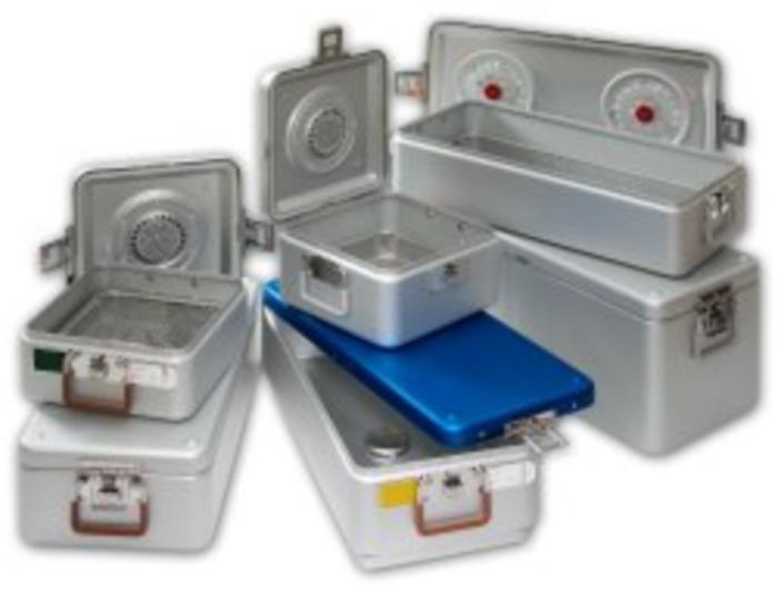 Melag instrumentskrin består av en nedre del som er laget av aluminium og en øvre del at rustfritt stål.