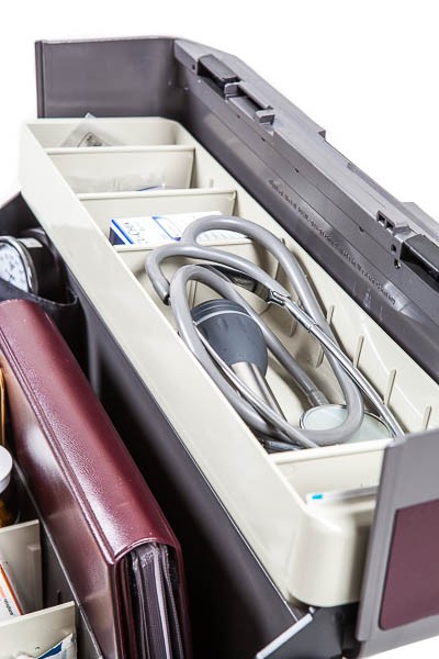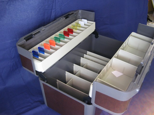 - Når kofferten åpnes deles halvdelene av lokket seg utover slik at innholdet blir lettere tilgjengelig.