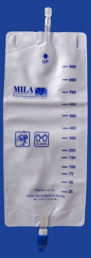 1000cc collection bag improved with volume marks beginning with 25cc, male luer lock and twist drain.