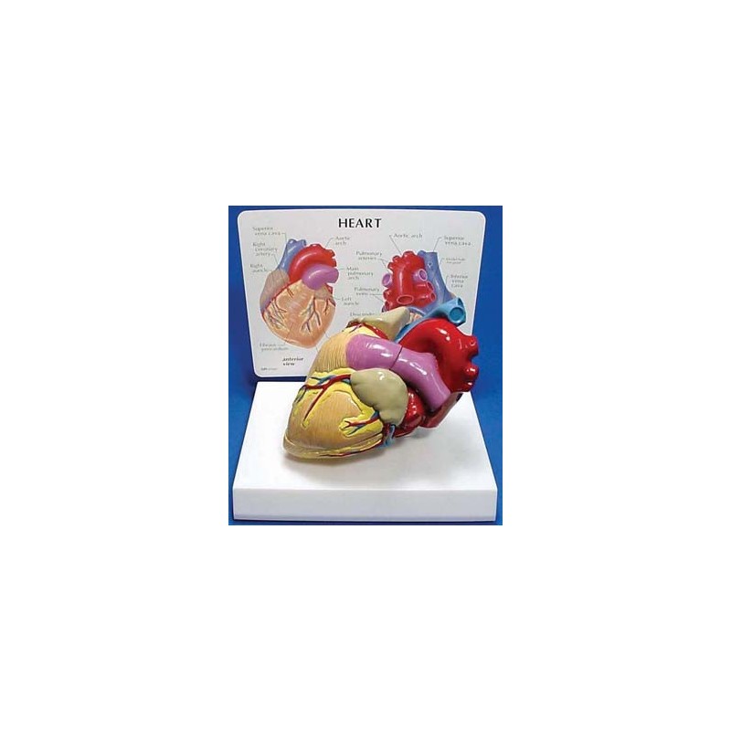 Heart Model Two piece model that opens in half. to show inner anatomy of human heart. Anatomy demonstrates inner chambers. mitral and tricuspid valves. major blood vessels entering and leaving heart. and external cardiac vessels. Size: 4" x 3 1/2" x 6". Hand painted in color. plus colored explanatory chart.