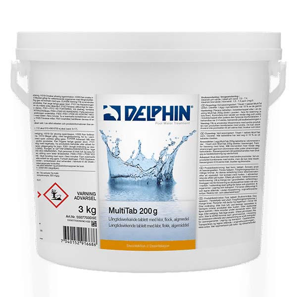 Anbefalt dosering: 1 tablett 200 gr / 20 m3 vann.
