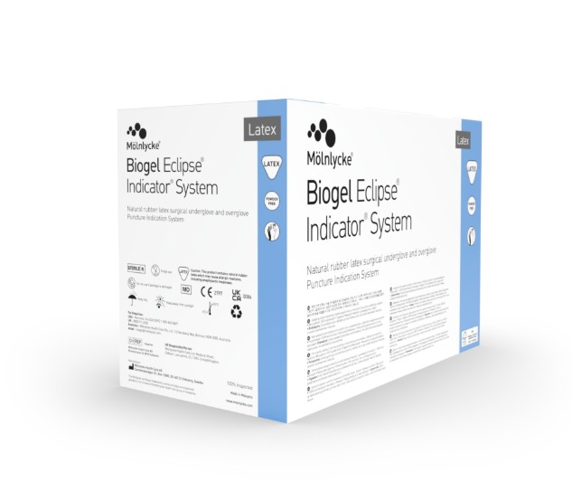 Biogel Eclipse® Indicator® System er en dobbelpakket operasjonshanske i naturgummilateks. Systemet består av en grønn innerhanske og en stråfarget ytterhanske som, når brukes sammen, danner et fargeindikeringssystem6 . Biogel Eclipse® Indicator® System er bevist å gi en tydelig, rask og stor fargeindikering i tillegg til svært god passform, utmerket barrierebeskyttelse7,8, komfort og fingerfølsomhet9 .
