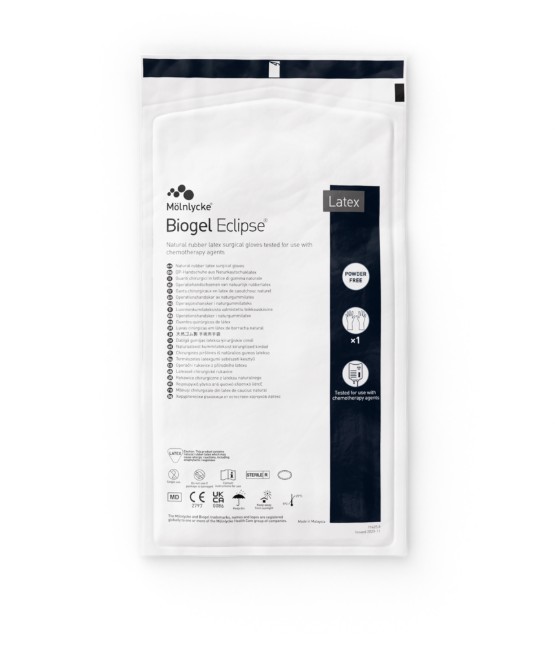 Biogel Eclipse® er en steril operasjonshanske i naturgummilateks. Den er betydelig mykere enn våre vanlige hansker i naturgummilateks. Den kan brukes alene eller sammen med Biogel Eclipse® Indicator® Innerhanske for å danne et fargeindikeringssystem som er dokumentert å gi en tydelig, rask og stor fargeindekering ved perforasjon4 . Hansken har utmerkede barriereegenskaper5,6, i tillegg til svært god passform, komfort og fingerfølsomhet7 . Testet og godkjent for bruk ved kjemoterapeutiske midler**.