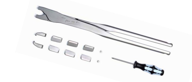 The basic body is delivered with 3 different spreader inserts, one forceps insert and screwdriver T8.