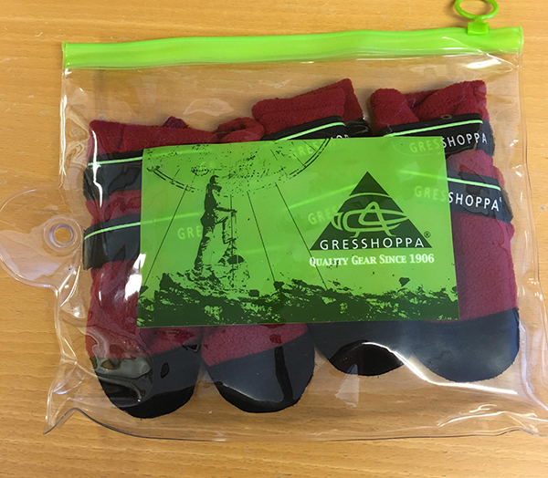 Gresshoppa potesokk med enkel borrelås til feste. 4 cm langt skaft. Forsterket med skinn også over tærne for at neglene ikke skal gå gjennom sokken.