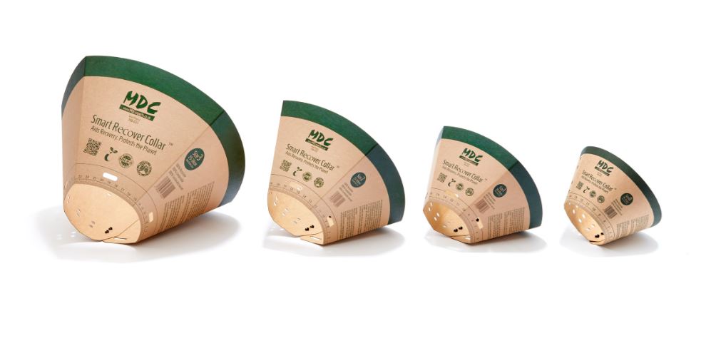 Like you, MDC is concerned for our environment; we want to work more sustainably and help you make a Greener Veterinary Practice. We’ve removed unnecessary and single-use plastics at every opportunity and introduced recycled and recyclable packaging where we can. MDCs’ new and revolutionary ‘Smart Recover Collar’ is another major step forward. It has all of the qualities of our existing Smart Collars – a lightweight and effective barrier to licking at sutures or self-trauma of wounds and is made of flexible (but robust) card allowing the free movement of the patient’s head and neck so that they can walk, eat, drink and sleep in comfort, helping a quick recovery.