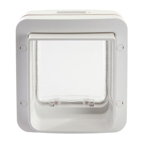 Elektronisk katteluke som skanner dyrets mikrochip og slipper bare husets egne dyr inn. Alle dyr som er inne kan slippe ut med mindre man ikke stenger luken for utgang.